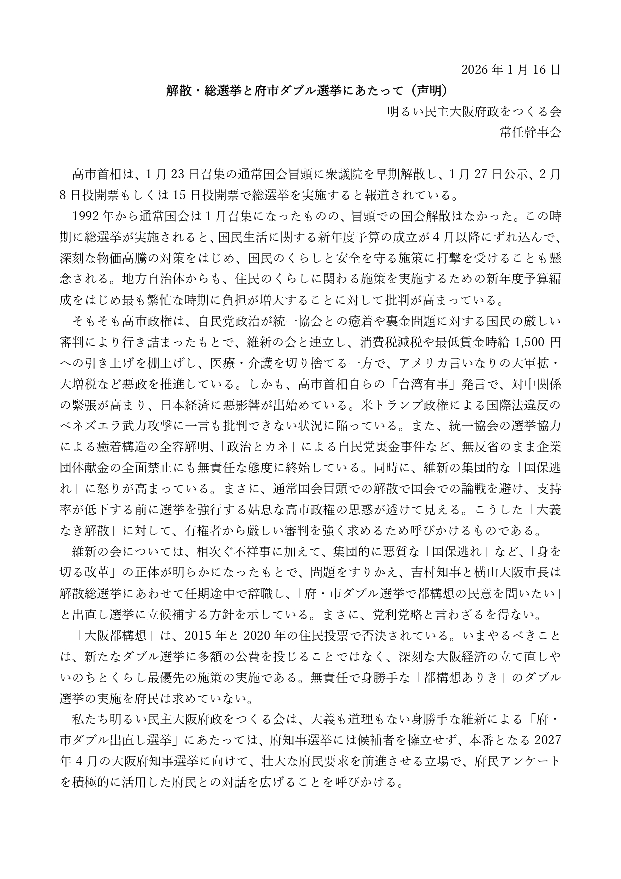 「明るい会」は、高市首相による通常国会冒頭の衆院解散・総選挙と、吉村知事らが「都構想」の信を問うなどとして、辞職、出直し選挙を総選挙と同日で行おうとしていることに対し、1月16日、常任幹事会声明を発表しました。(全文PDF)